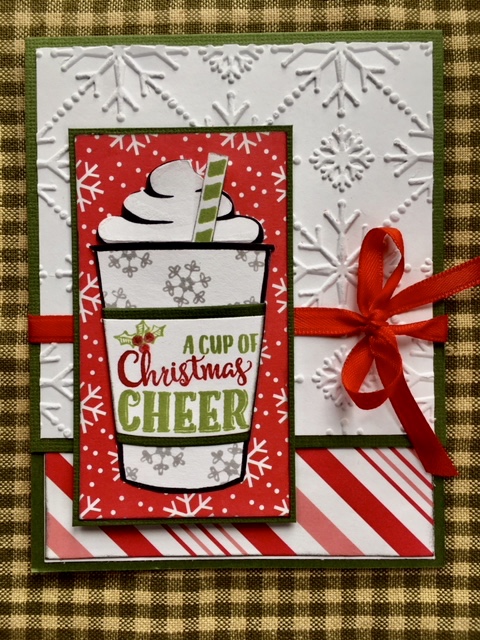 Love this card. I have a new embossing folder that has snowflakes smaller in scale and closer together to create a real snowy feeling. I used dies and punches to create the snowman, greeting, and snowflake. A touch of bling to the center of the snowflake finished it off. I also used my white gel pen to perk up the scarf a little !